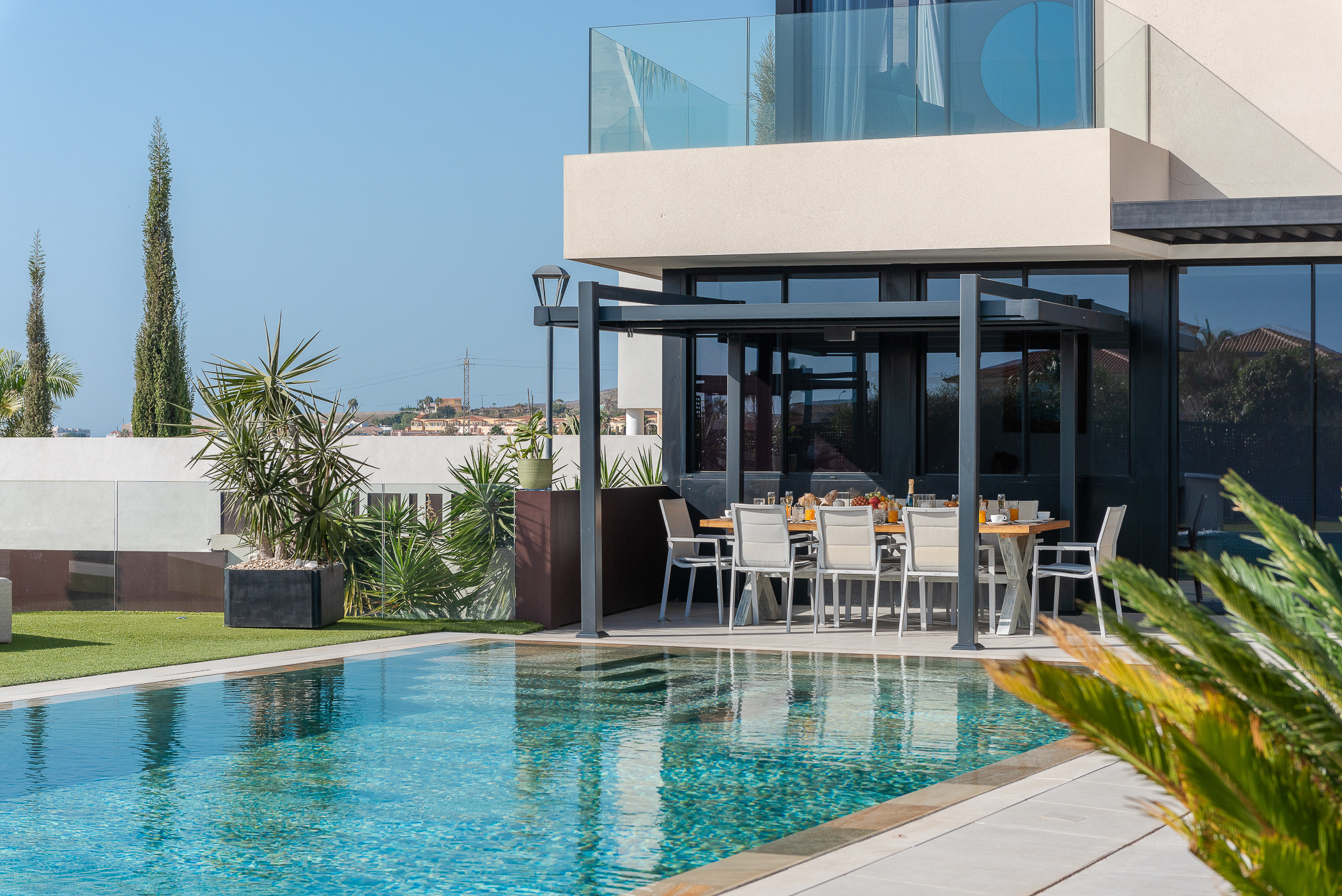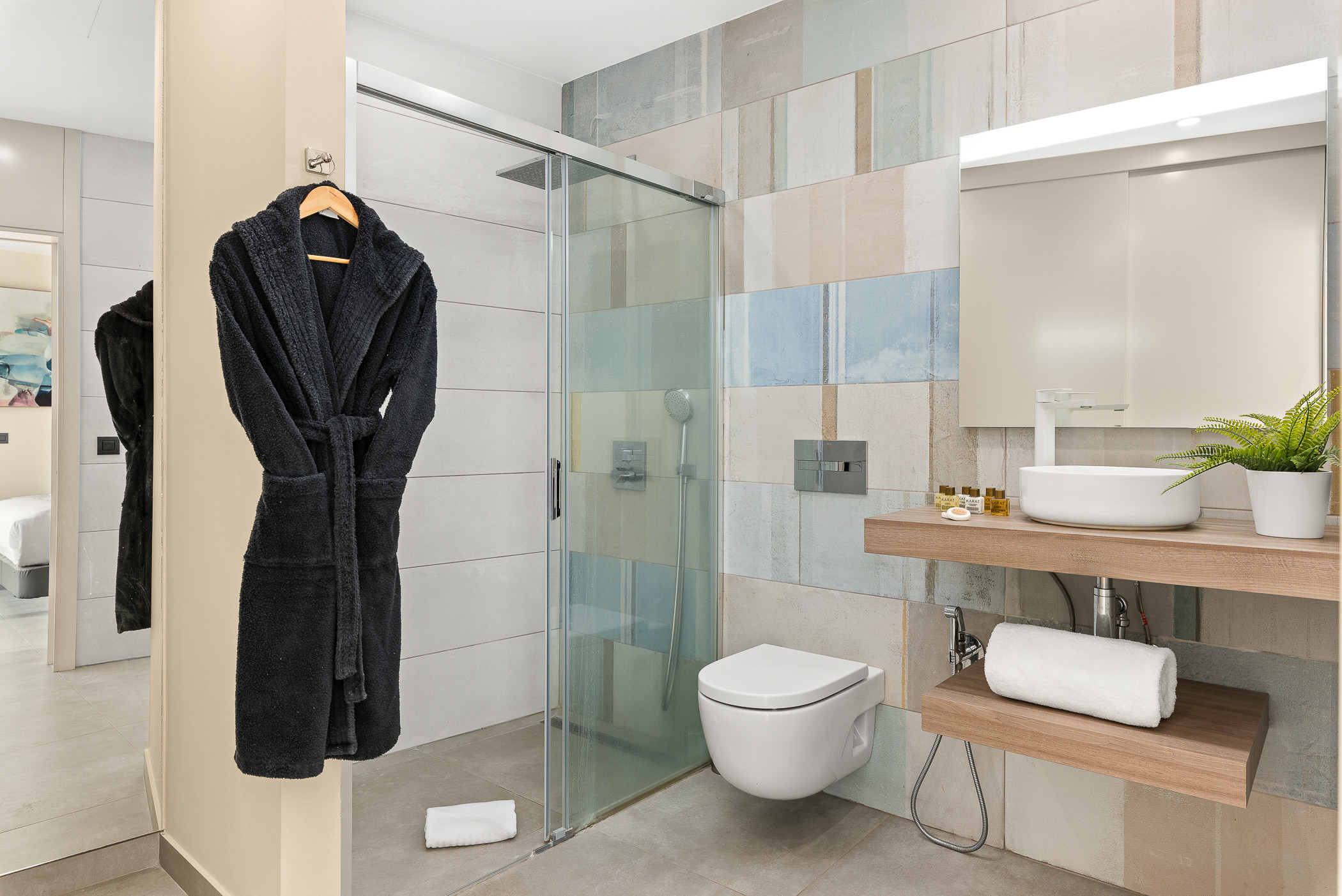 Con 4 amplios dormitorios tipo suite, esta villa acoge cómodamente hasta 8 personas. Cada habitación ha sido diseñada como un refugio privado de confort, incluyendo la suite principal, que cuenta con un baño en suite con bañera, ideal para desconectar y relajarse con total privacidad.