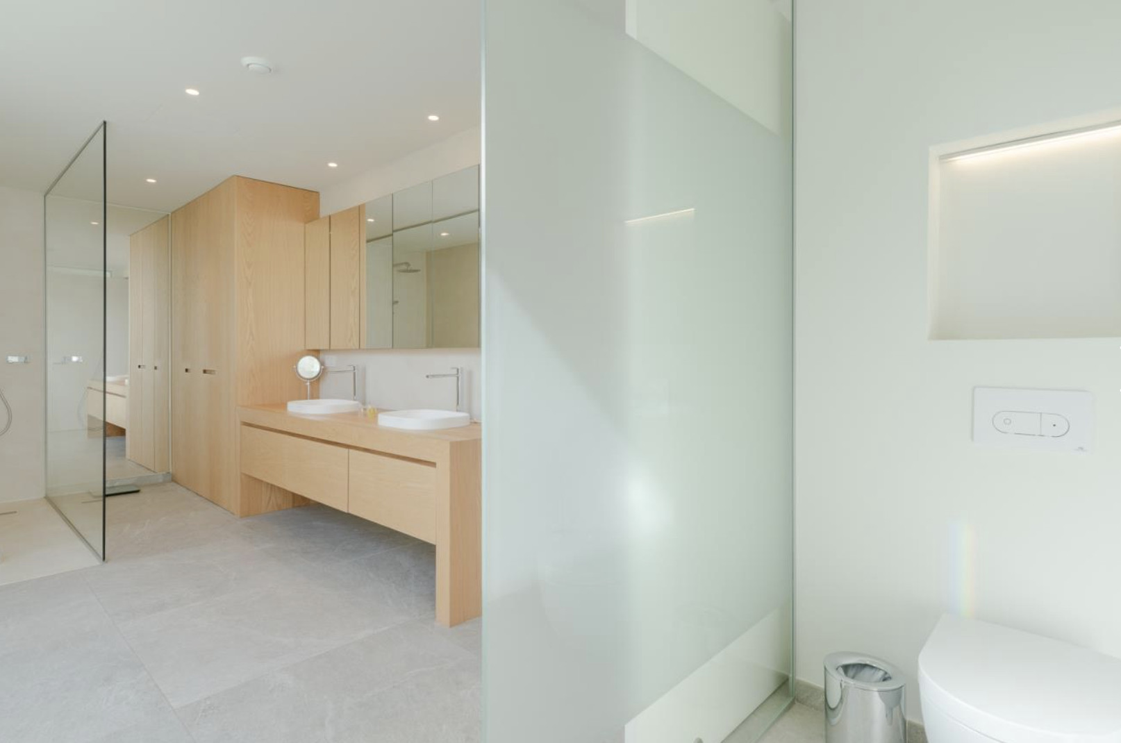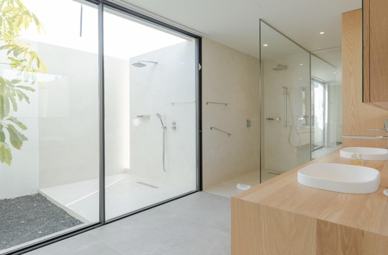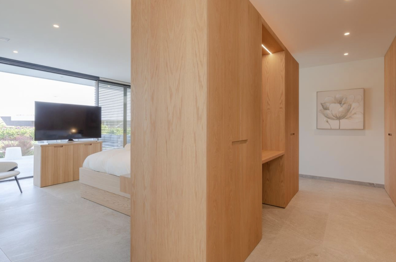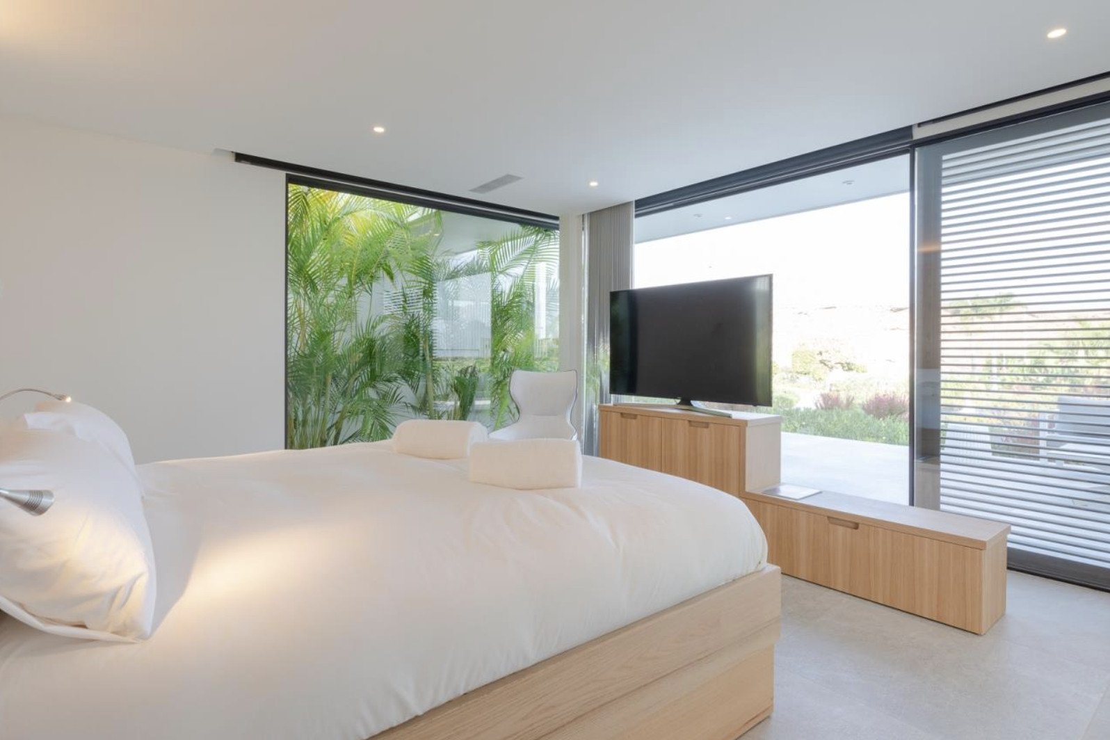 En la planta baja se encuentran los cuatro dormitorios en suite, cada uno con acceso directo a su propia terraza privada. Diseñados para el descanso y la desconexión, estos espacios ofrecen una cuidada selección de textiles, armarios vestidor de generosas dimensiones y baños donde cada detalle ha sido pensado para elevar la experiencia de confort.