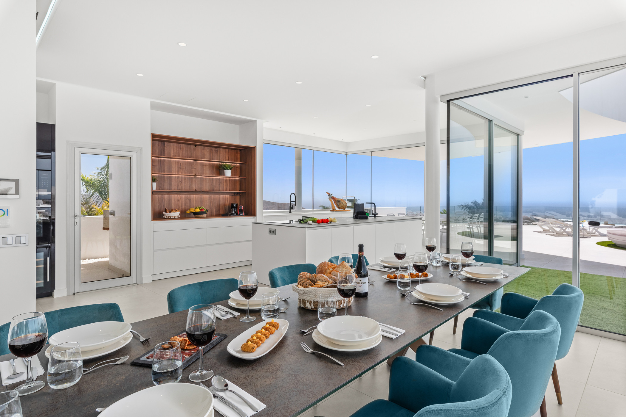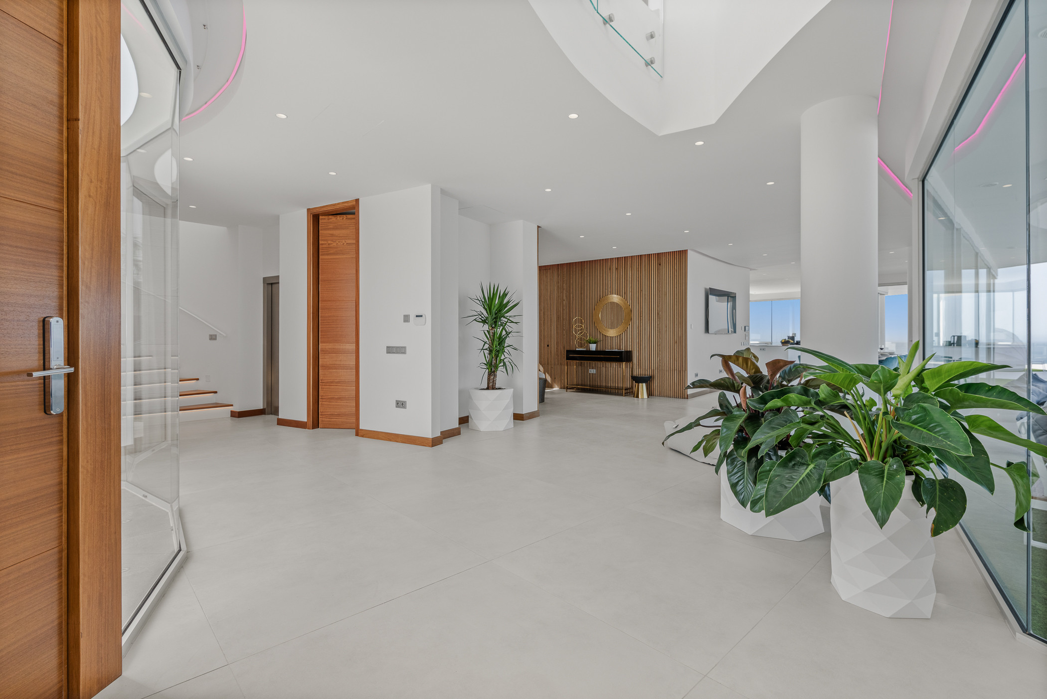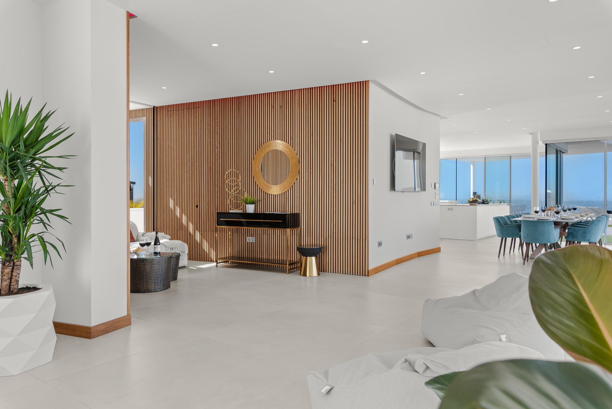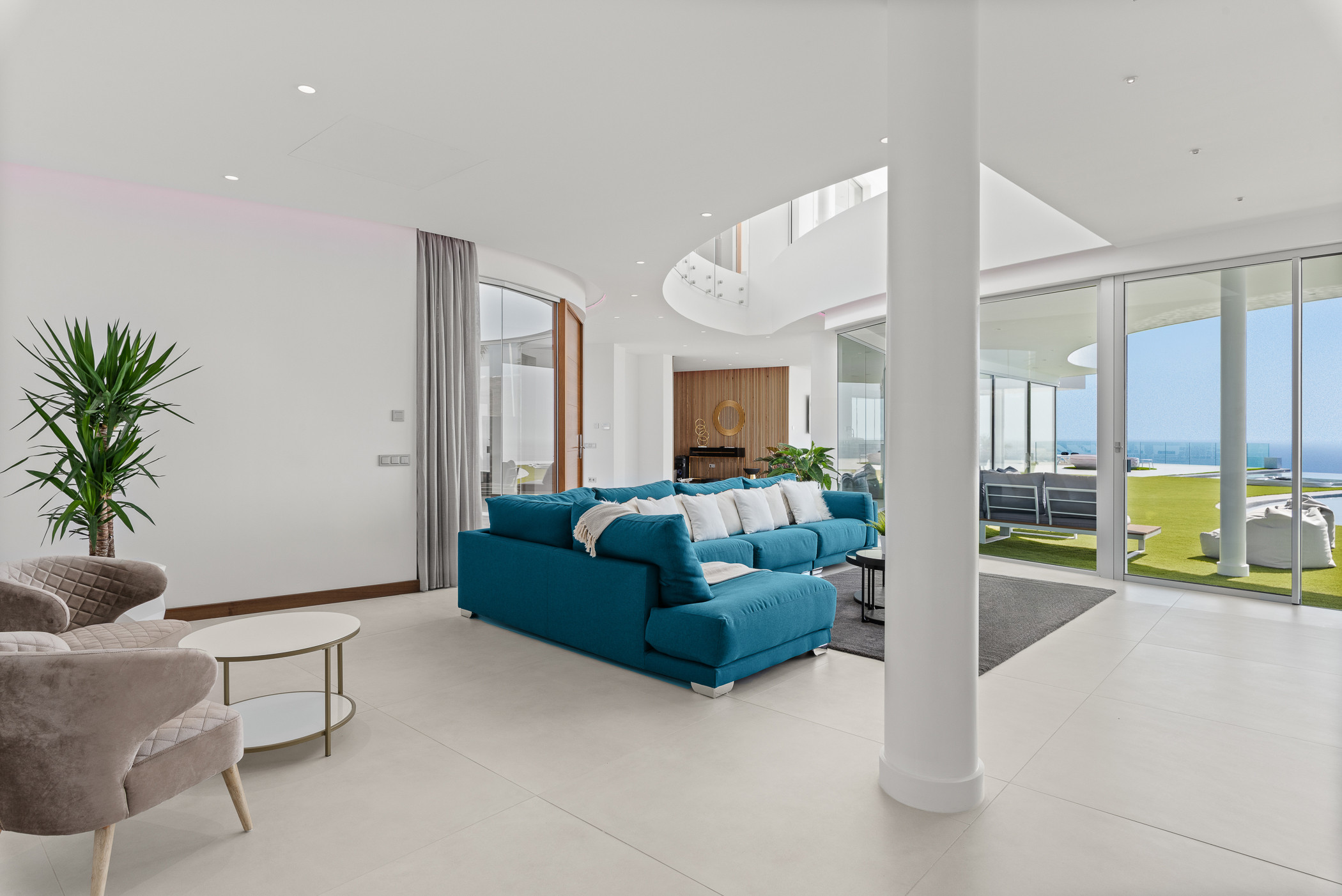 Al ingresar por la entrada principal tendrás acceso a la cocina moderna, el área de comedor y la amplia sala de estar. Estos espacios de concepto abierto se fusionan perfectamente y ofrecen vistas panorámicas al mar.