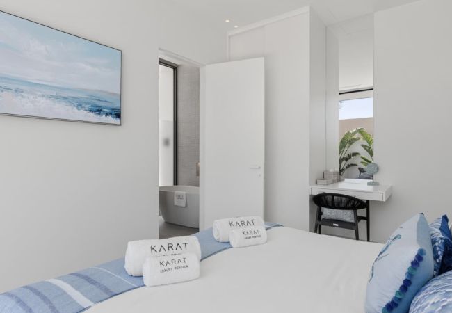 La suite principal, en la planta alta, es la joya de la villa. Con cama king-size de generosas dimensiones y una terraza privada de más de 30 m², ofrece vistas abiertas al océano y una privacidad total. Su baño acristalado, con bañera orientada al mar y ducha exterior, transforma el aseo diario en un ritual de bienestar.