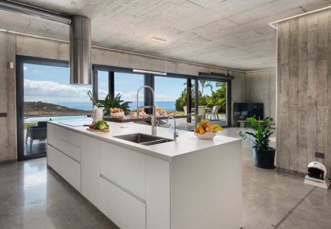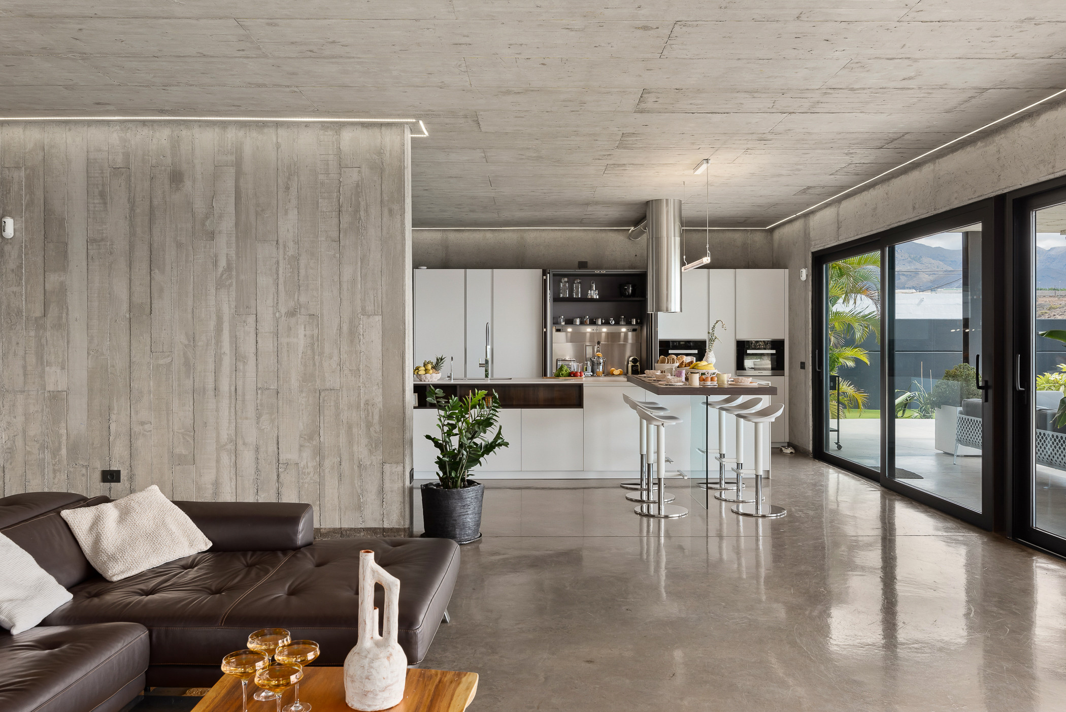 El interior no se queda atrás: un diseño contemporáneo con espacios diáfanos, techos altos y ventanales de suelo a techo que permiten que la luz y las vistas del barranco y del mar se fundan con cada rincón. La cocina moderna, perfectamente equipada, se abre hacia un salón acogedor que invita tanto a la contemplación como a la convivencia.