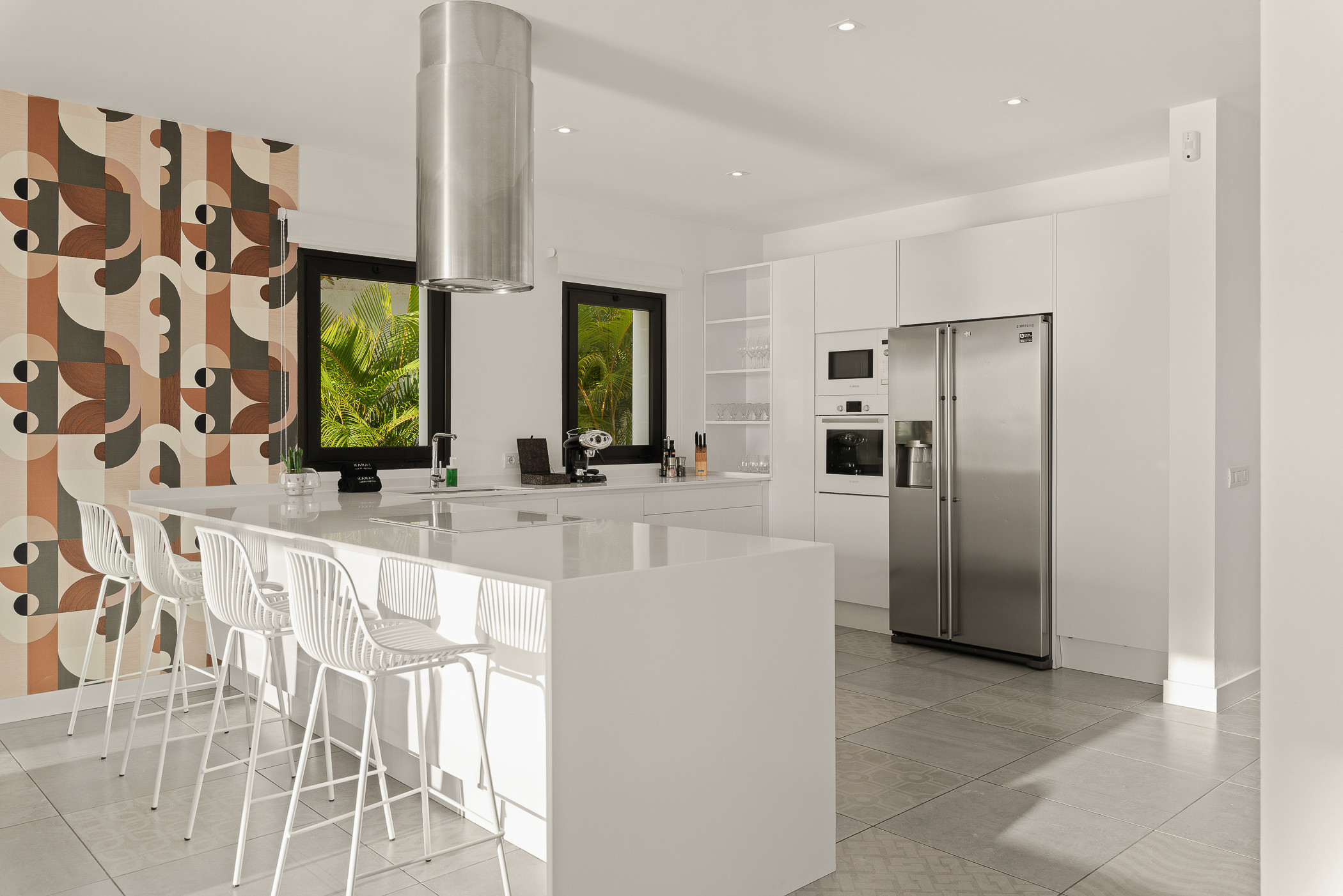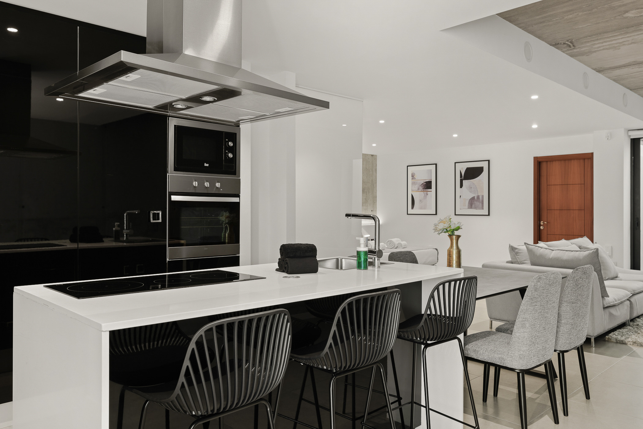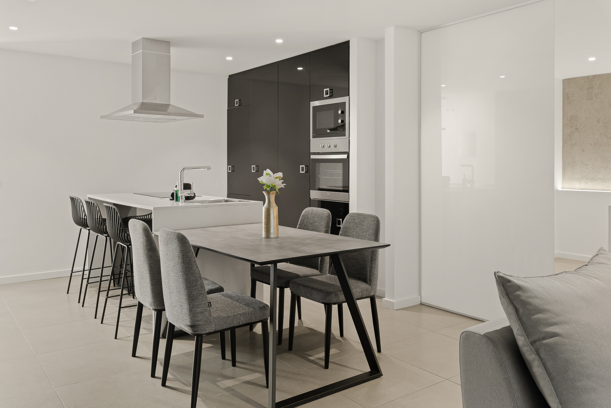 El interior destaca por su elegancia contemporánea, con grandes ventanales que inundan los espacios de luz natural y una cocina totalmente equipada para disfrutar de cualquier momento culinario.