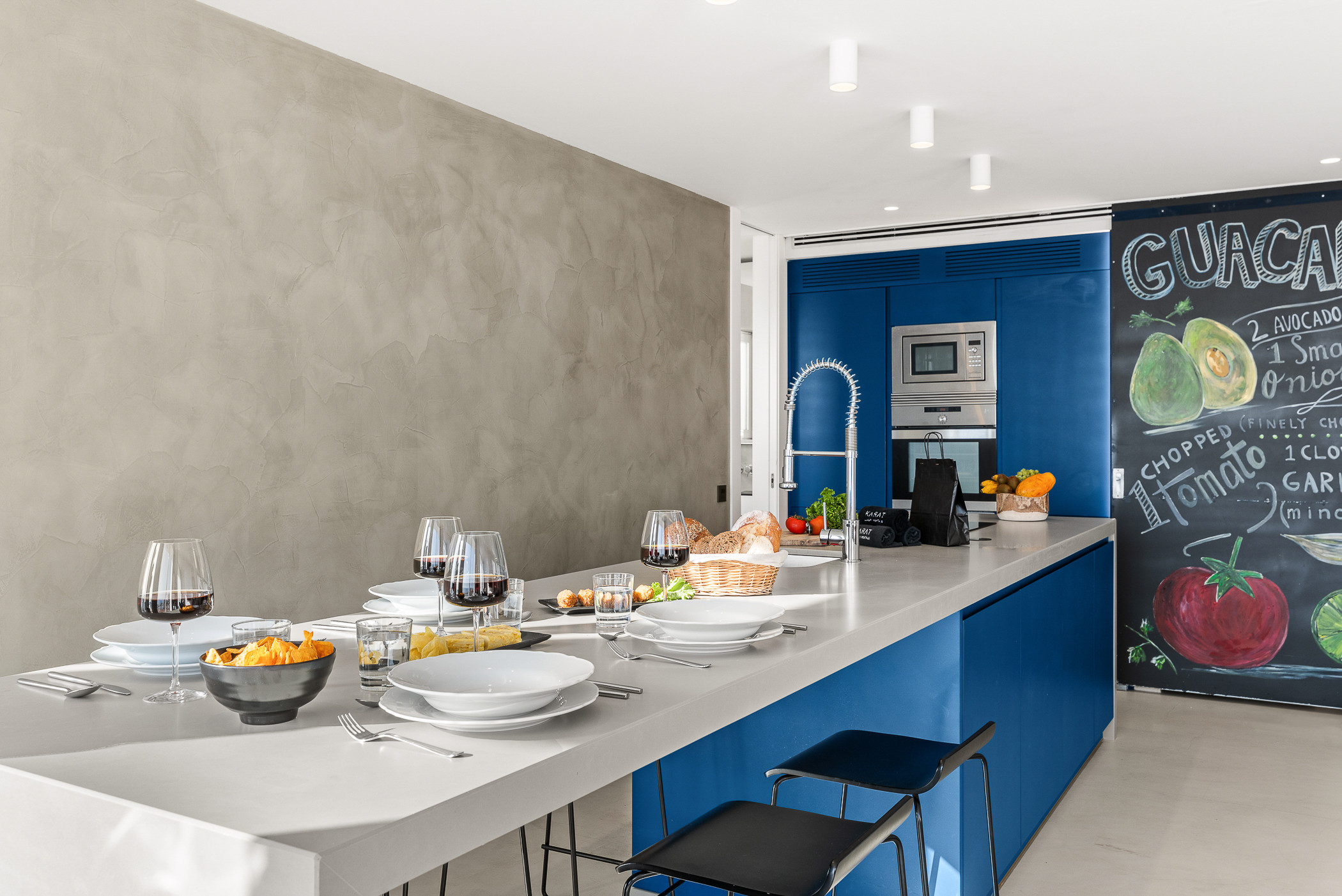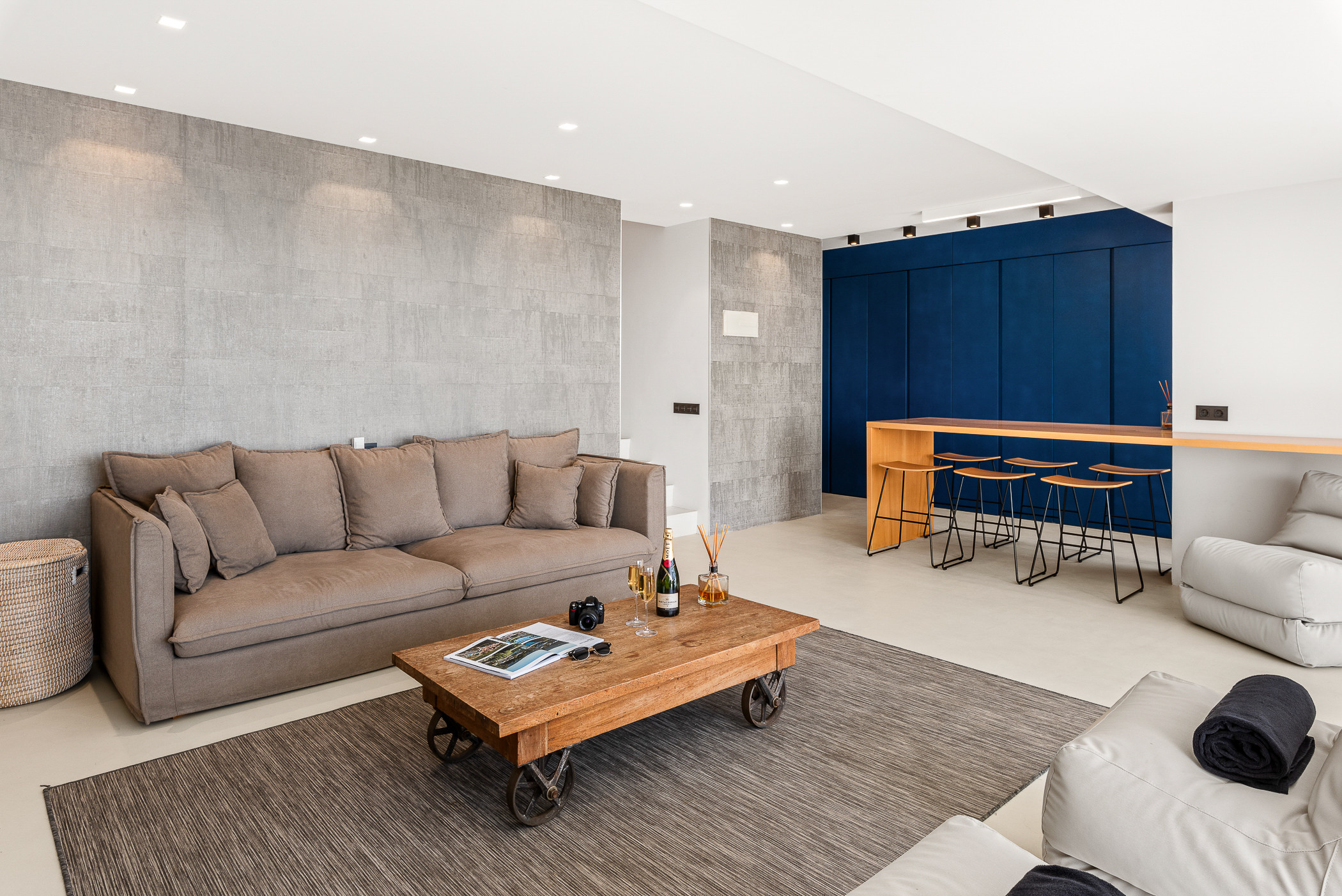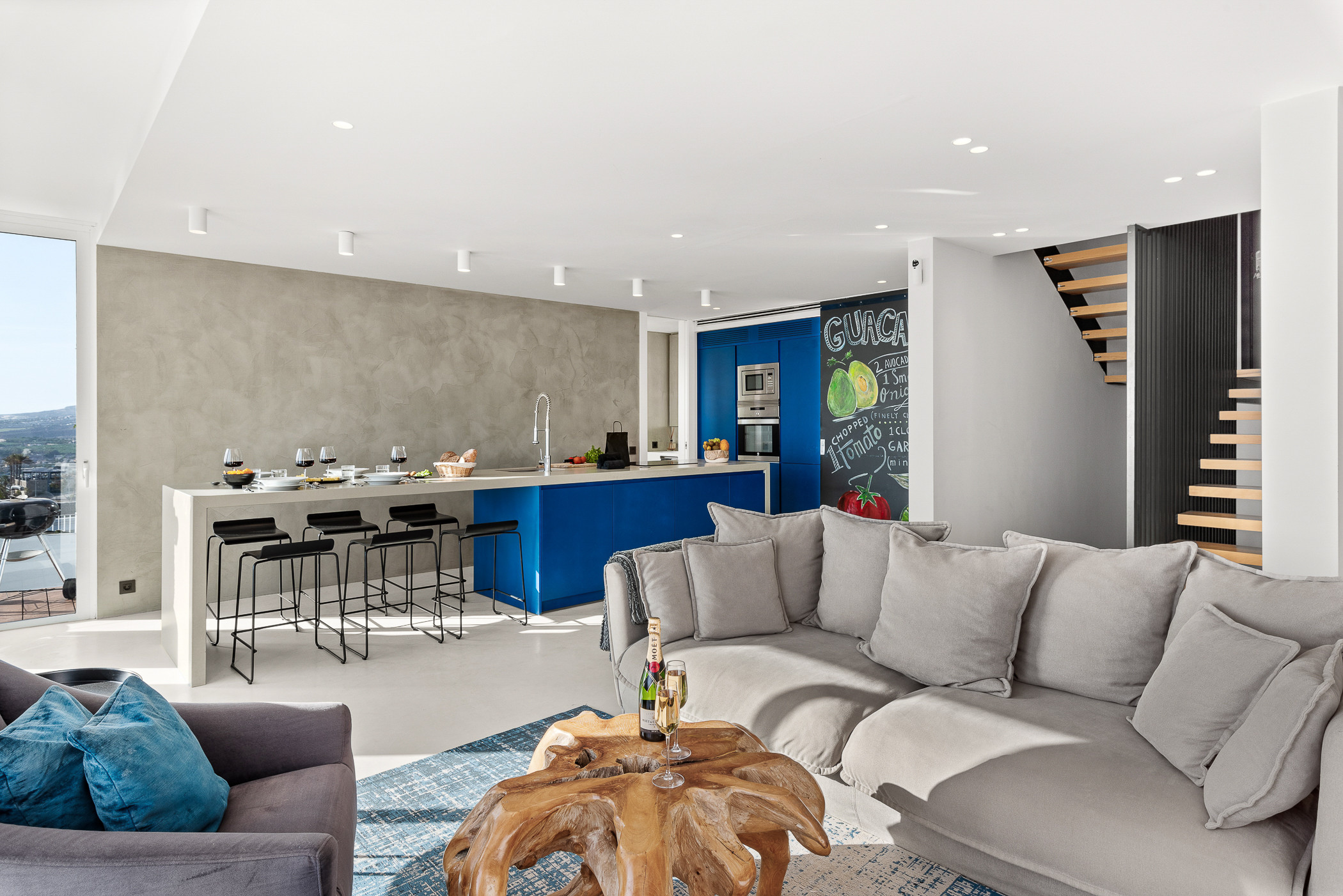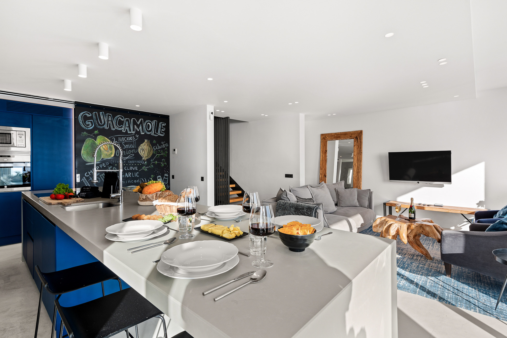 La zona de día conecta una cocina de isla vanguardista con el salón principal, creando un espacio fluido y luminoso ideal tanto para disfrutar en pareja como para compartir con amigos o familia. En la planta inferior, un amplio salón con televisión de última generación ofrece una atmósfera acogedora para tardes de cine o entretenimiento en grupo.