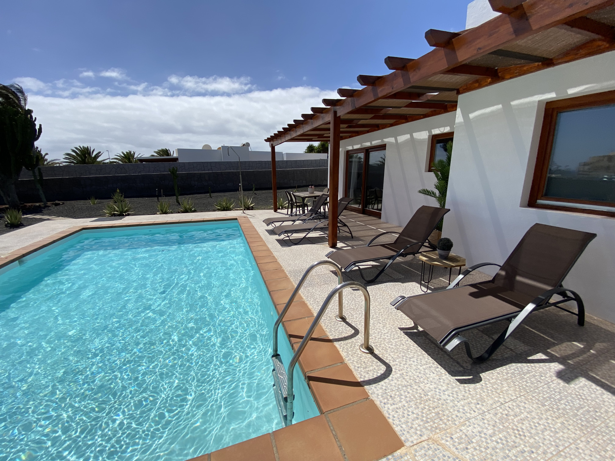 En un enclave muy especial, Villalia Capri dispone de una amplia zona exterior bien equipada y una piscina privada de 6 x 4 m para que disfrutes del buen clima de Lanzarote y de unas vacaciones inmejorables.