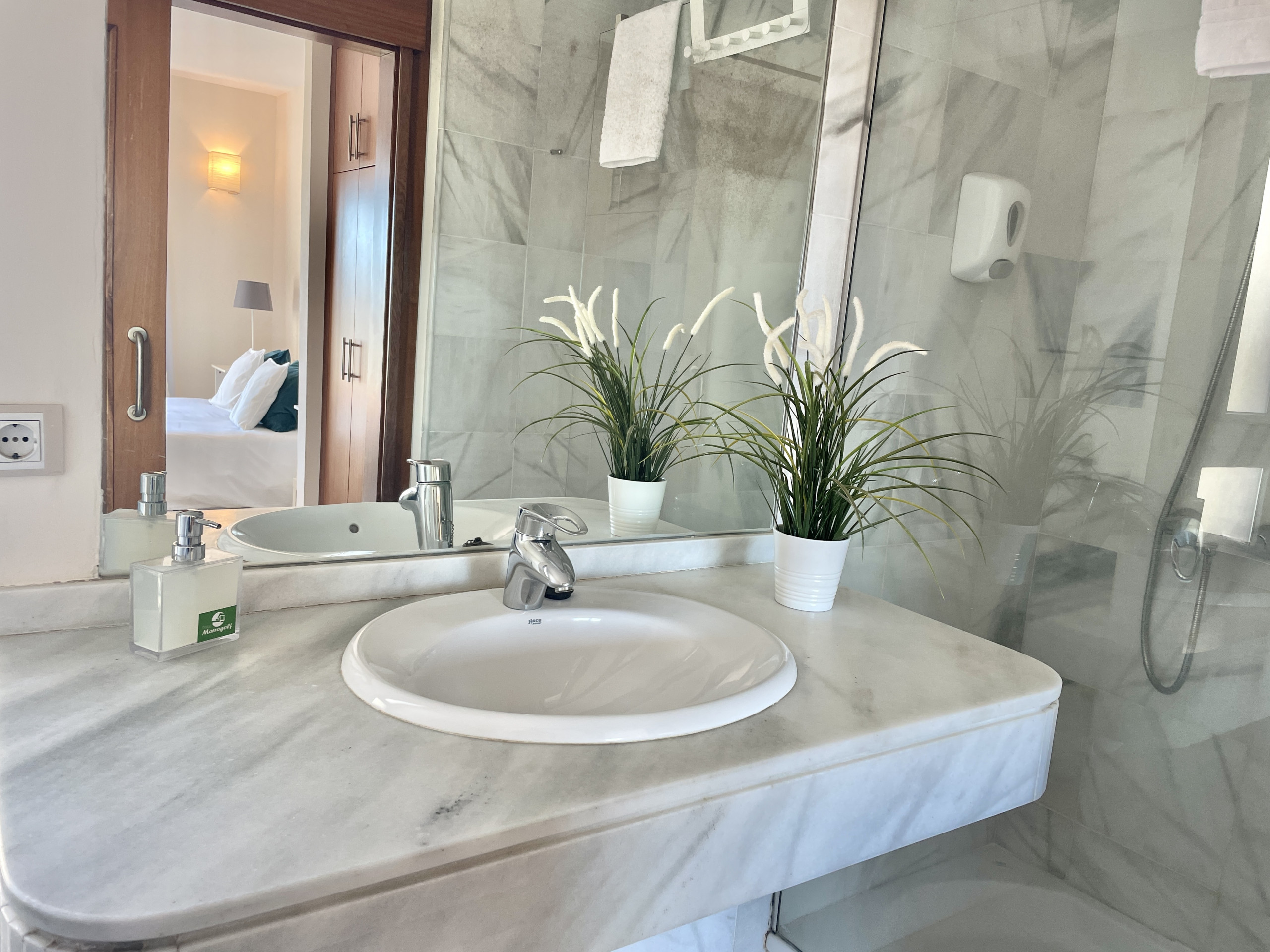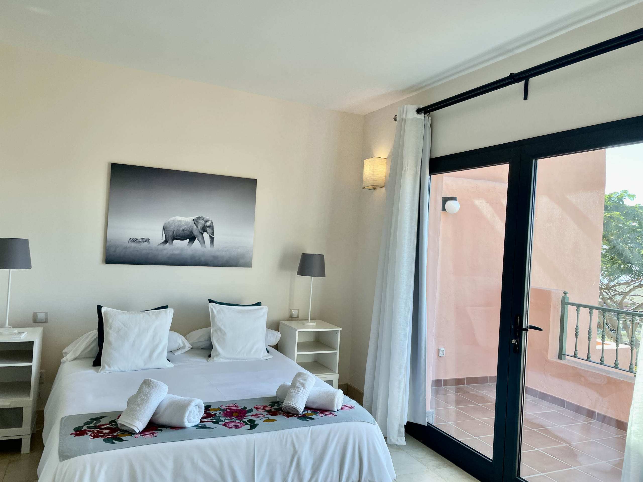 - Dormitorio principal con cama doble, vestidor, baño en suite con ducha y terraza con vistas al campo de golf.