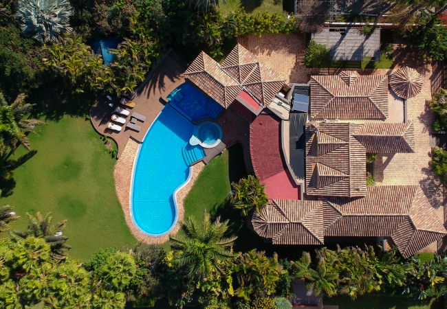 Frondoso jardín tropical, con cabaña de madera ideal como casa de invitados o zona de juegos, barbacoa integrada, camas elásticas y casita de muñecas para los más pequeños.