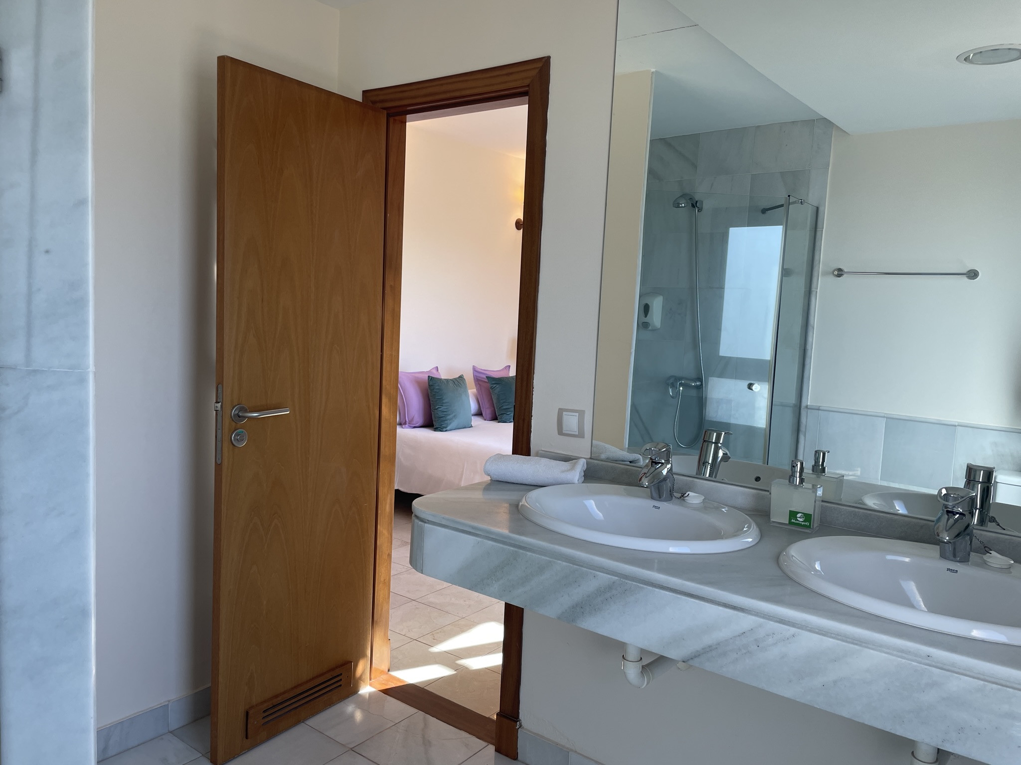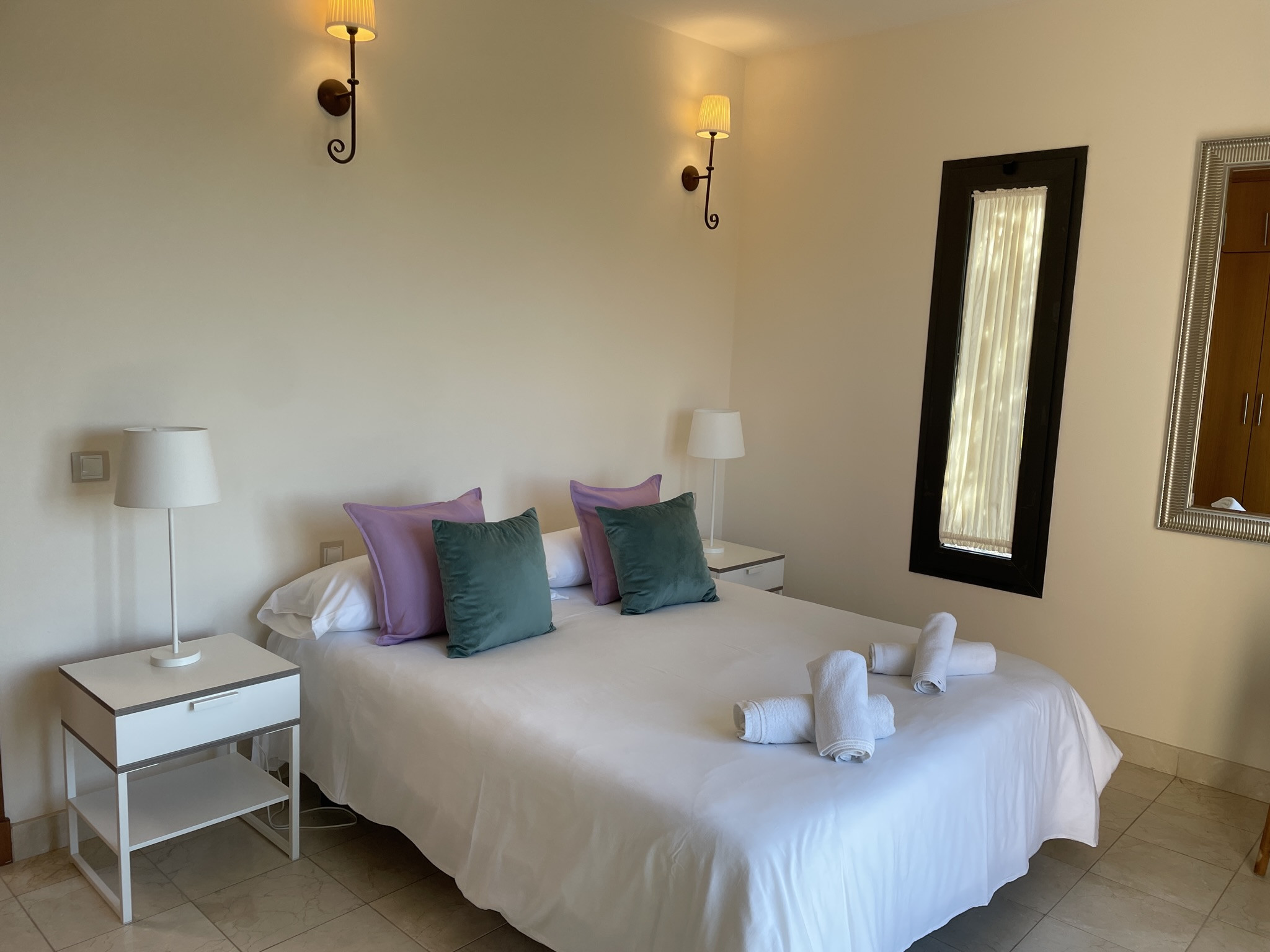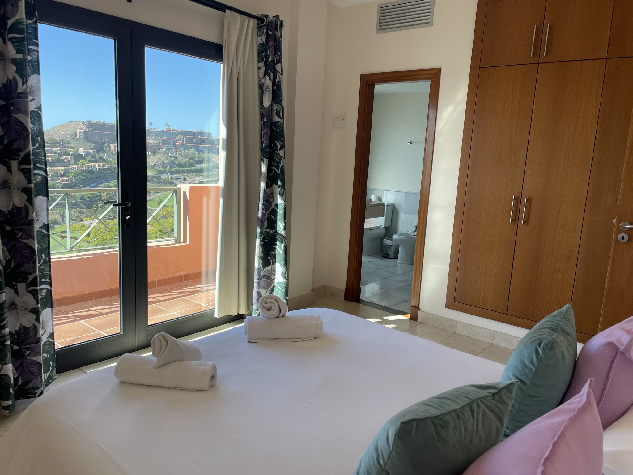 - Dormitorio principal con cama doble, baño en suite con ducha, vestidor y terraza con vistas al campo de golf.