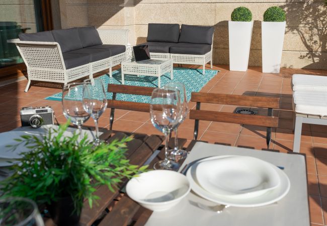 Fully equipped independent kitchen next to a large dining room with access to its extensive and equipped terrace, where you can enjoy the tranquility and fresh air of the Rías Baixas.