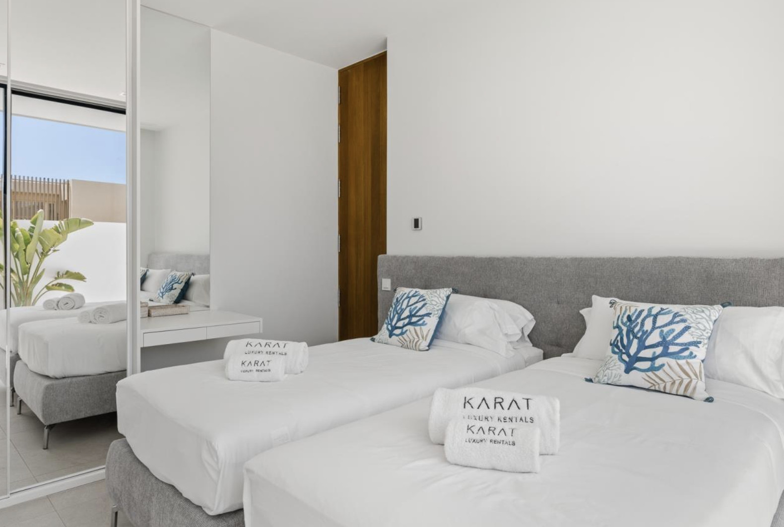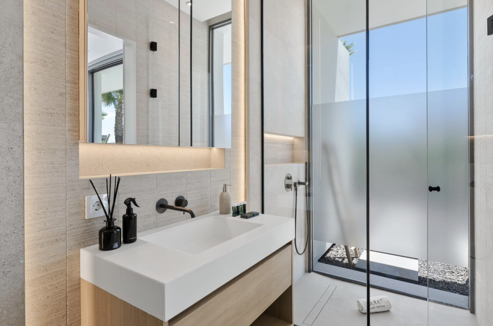 From the first moment, Villa Delmare captivates: a cobbled entrance leads to a large wooden door flanked by a relaxing fountain, anticipating the sense of calm that defines the entire experience. The double-height hall opens to a main lounge bathed in light, with rest areas, dining room and a cutting-edge design kitchen fully equipped. A screen of over 100 inches turns this space into the perfect setting for both intimate coexistence and sophisticated entertainment.