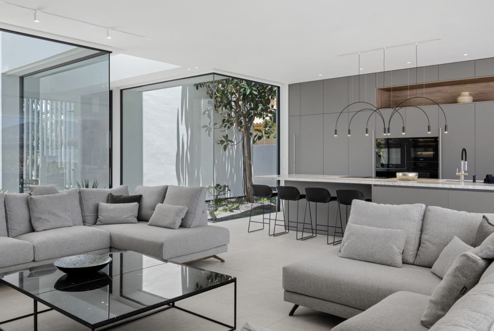 At the top of La Caleta, one of the most coveted areas of Costa Adeje, Villa Delmare stands as a tribute to contemporary luxury and the art of living facing the sea. This residence with clean lines and serene soul unfolds over 900 m² of habitable spaces designed with an exquisite balance between modern architecture, noble materials and a harmonious connection with the natural environment.