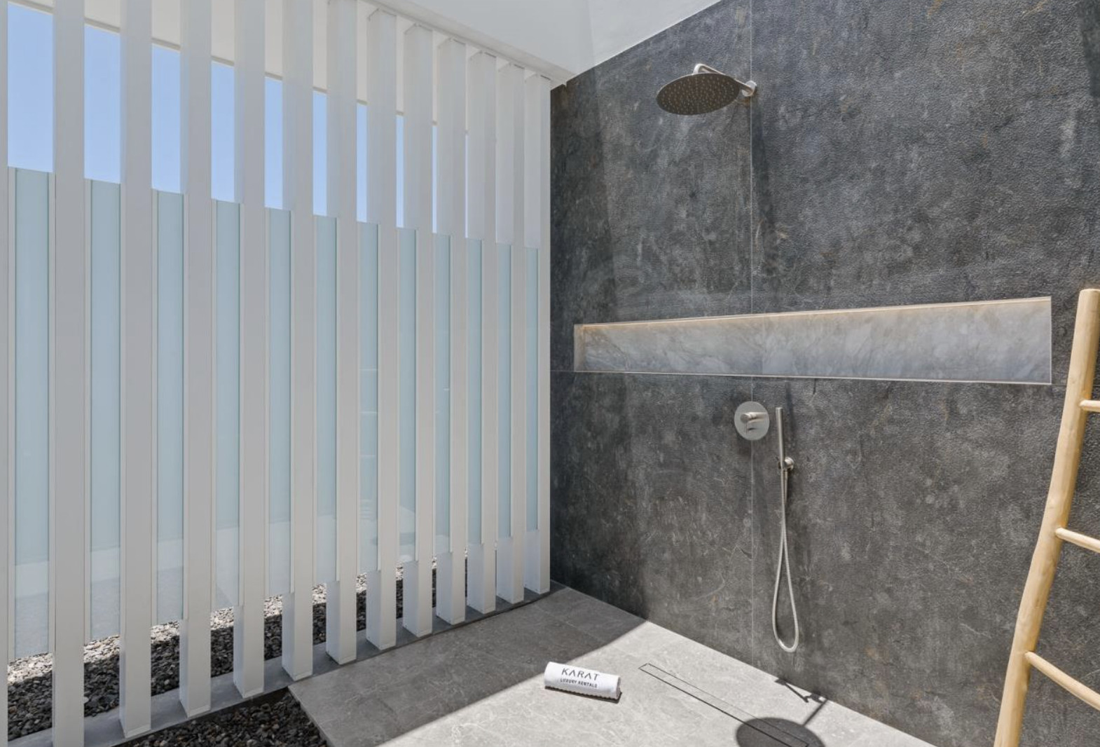 The main suite, on the upper floor, is the jewel of the villa. With a king-size bed of generous dimensions and a private terrace of over 30 m², it offers open views of the ocean and total privacy. Its glazed bathroom, with a bath oriented towards the sea and an outdoor shower, transforms daily grooming into a wellness ritual.