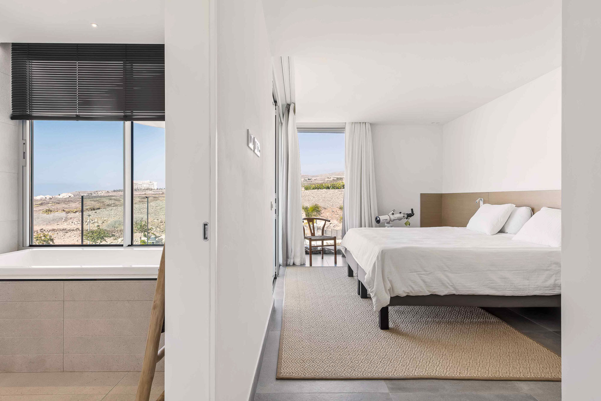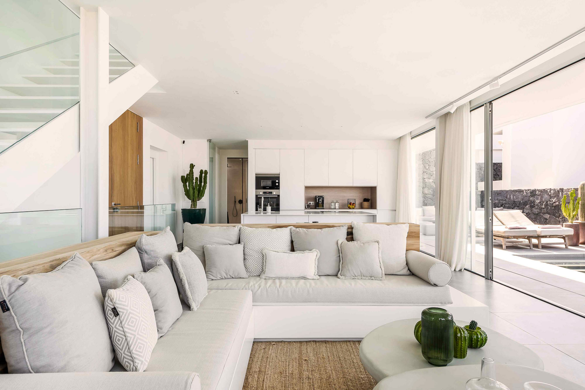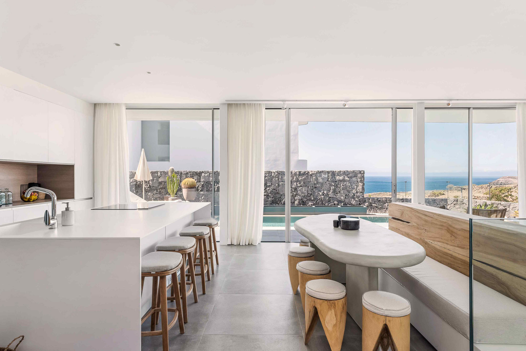 The ground floor is tidy and structured for your comfort and relaxation. The spacious living-dining room, perfectly furnished and decorated with natural elements, is complemented by a fully equipped American style kitchen that allows a fluid transit between these spaces. This part of the villa has a delightful outdoor dining area and a beautiful heated swimming pool with views as far as the eye can see.