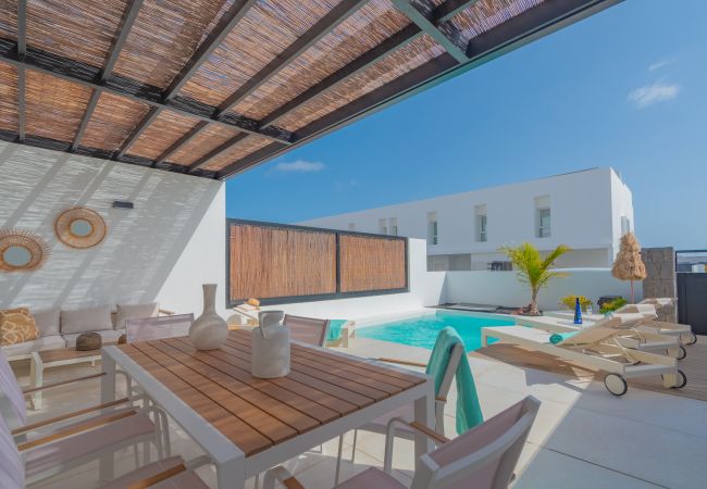Enjoy with family, couple or friends this villa with private heated pool located in a perfect area to immerse yourself in Lanzarote and its views of the sea, Fuerteventura and the island of Lobos.