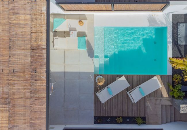 Distributed across two spacious floors: on the ground floor, a bright open space integrates the living-dining room and American kitchen, where a full bathroom is located. Its exterior features a spacious front terrace with a heated private pool, and a rear terrace with a volcanic stone garden and barbecue.