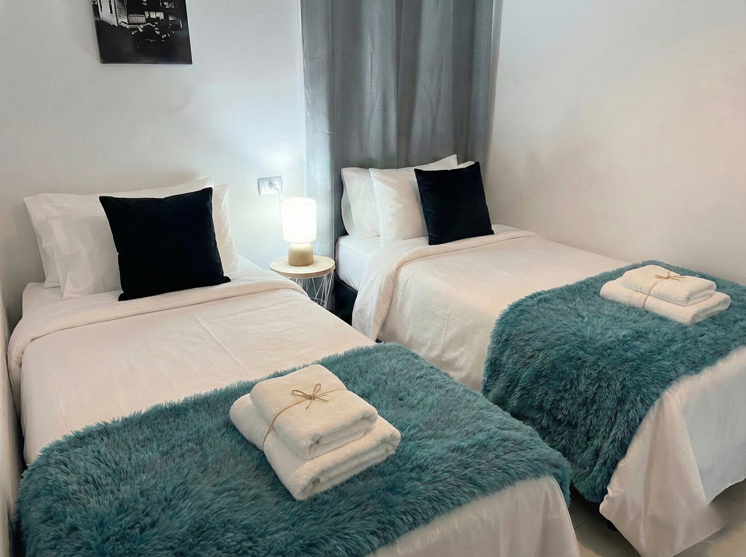 The villa consists of 3 bedrooms; one double bedroom with 1.50m x 1.90m bed and en suite bathroom, two bedrooms with 2 single beds each. There is a second bathroom.