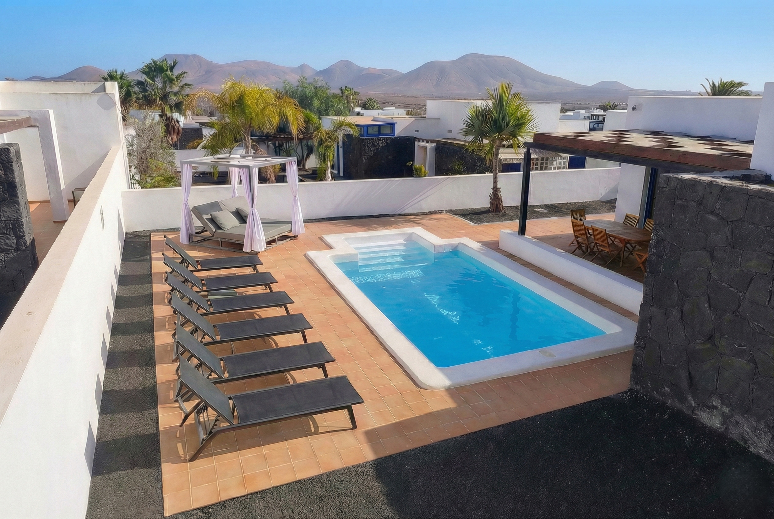 Enjoy with family, couple or friends this villa with private heated pool located in a perfect area to immerse yourself in Lanzarote and its views of the sea, Fuerteventura and the island of Lobos.