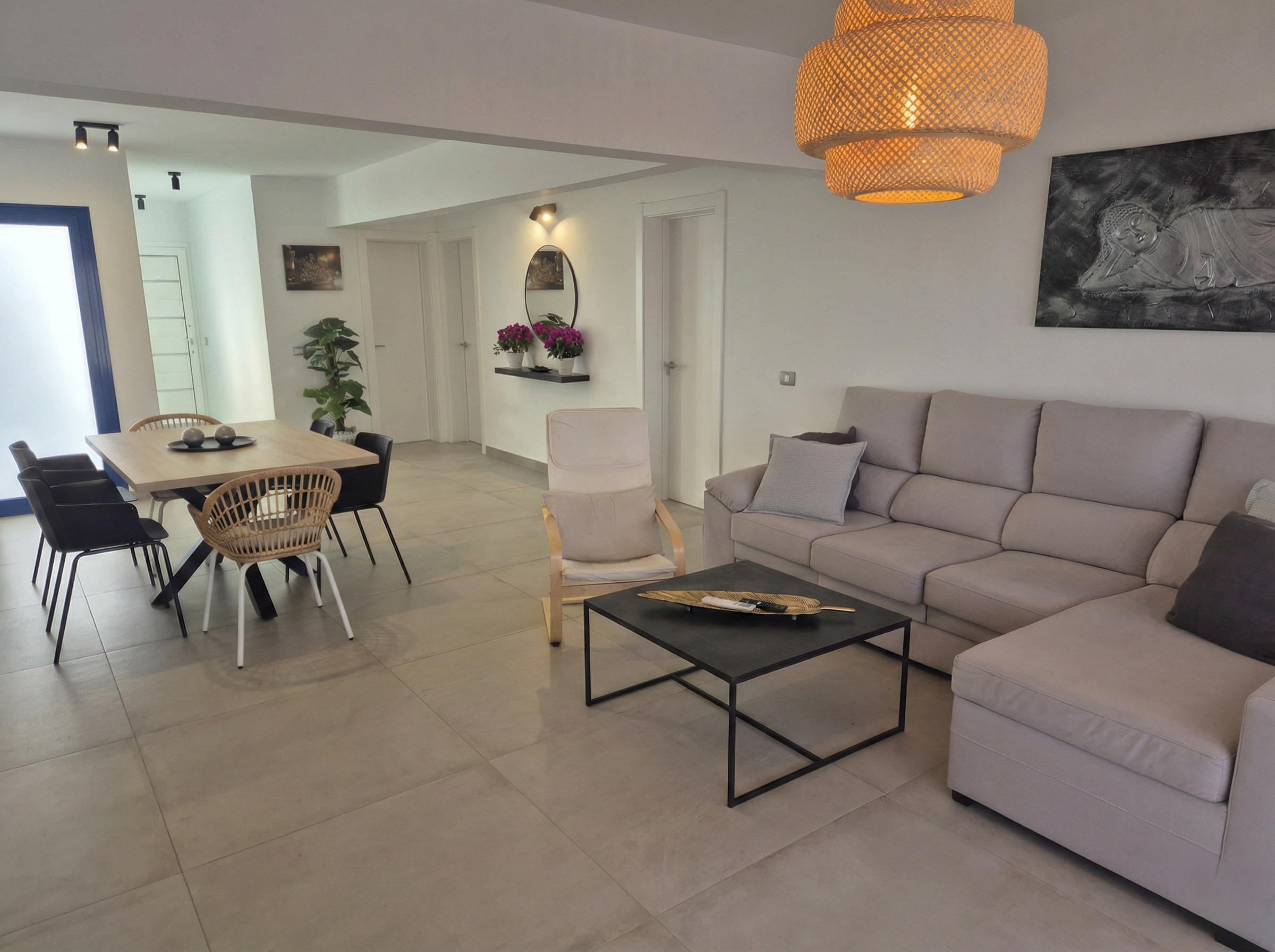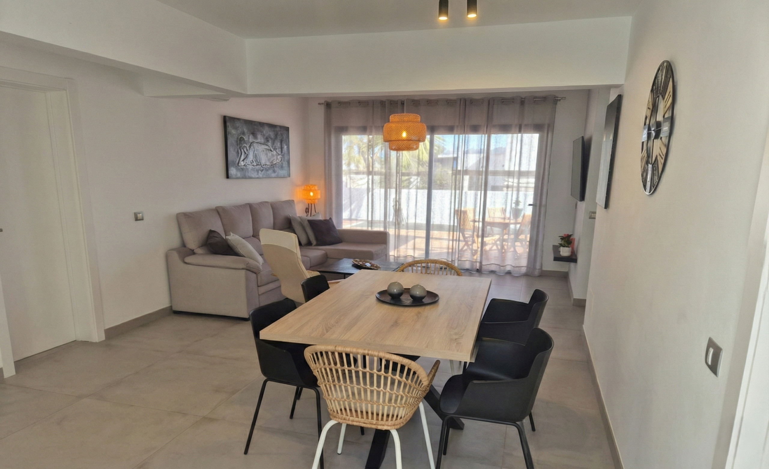 It has 3 cosy bedrooms and 2 bathrooms (both with shower tray); the master bedroom with double bed of 1.50 x 1.90 and en suite bathroom and a second bedroom with double bed and a third bedroom with 2 single beds. Living-dining room very luminous thanks to the large windows and with direct access to the outside area. Fully equipped kitchen with dishwasher so you have everything you need to enjoy with your family and friends.