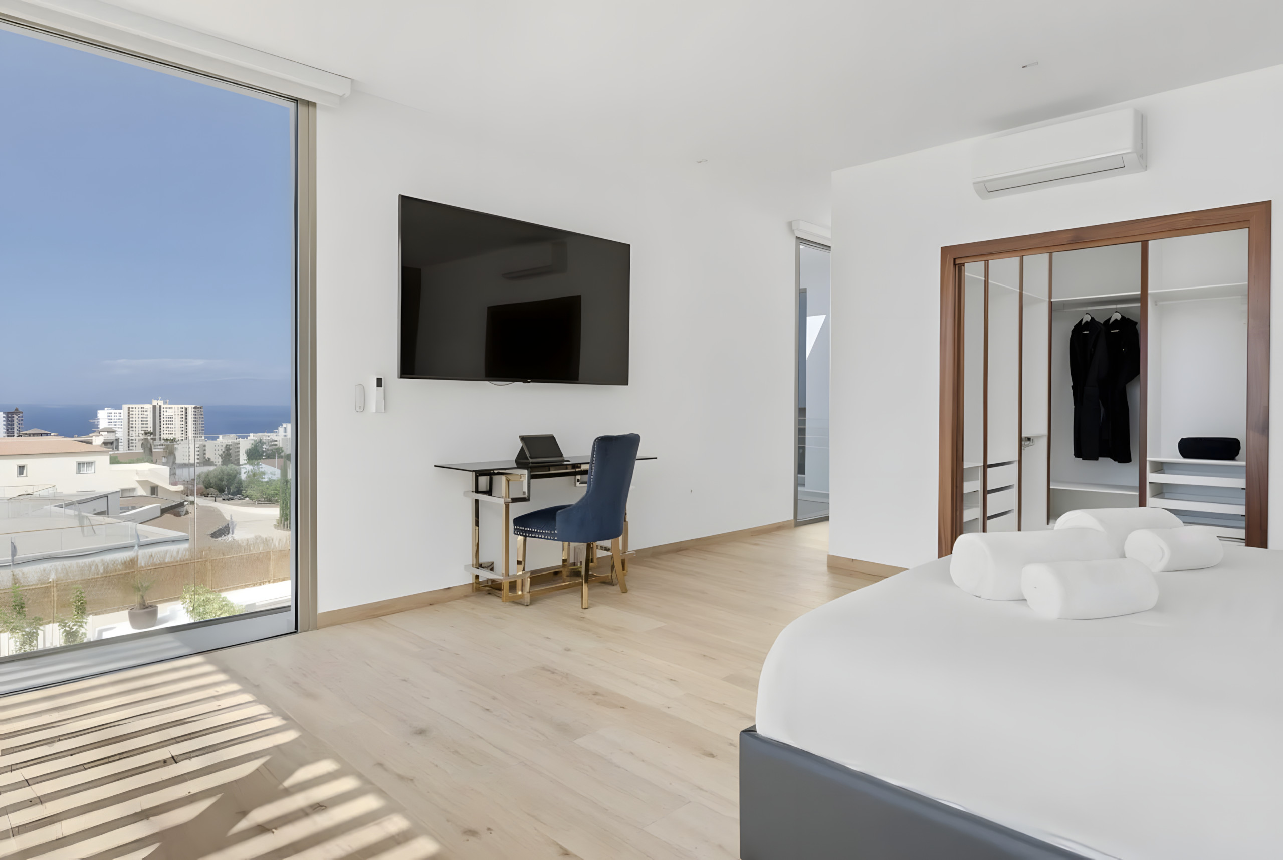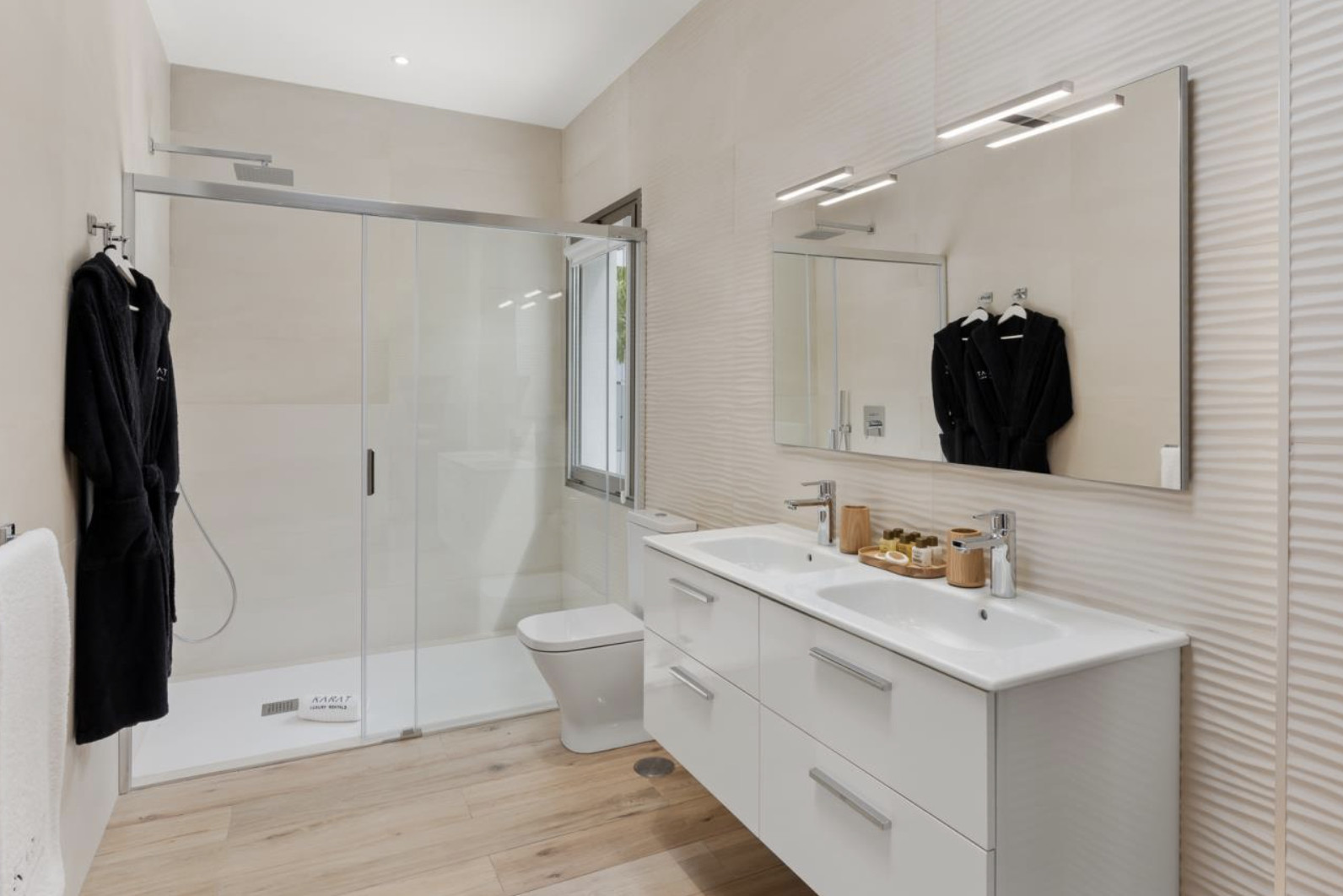 Go up and discover a private oasis: three rooms full of calm and elegance, two of them en suite. The main bedroom offers you a movie-style dressing room and a terrace with a jacuzzi, perfect for watching the sun set behind the sea, drink in hand.