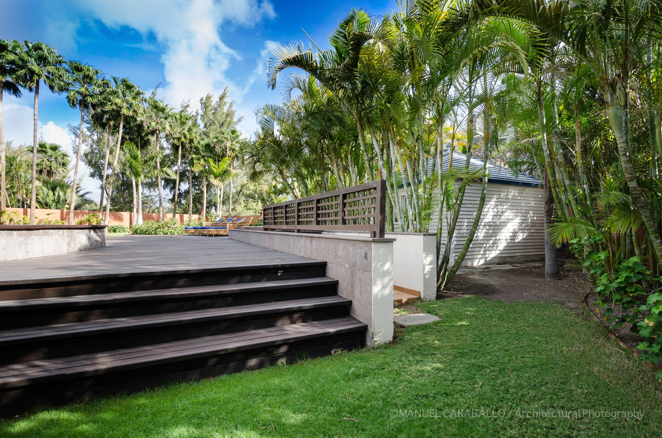 Lush tropical garden, with wooden cabin ideal as a guest house or play area, integrated barbecue, trampolines and playhouse for the little ones.