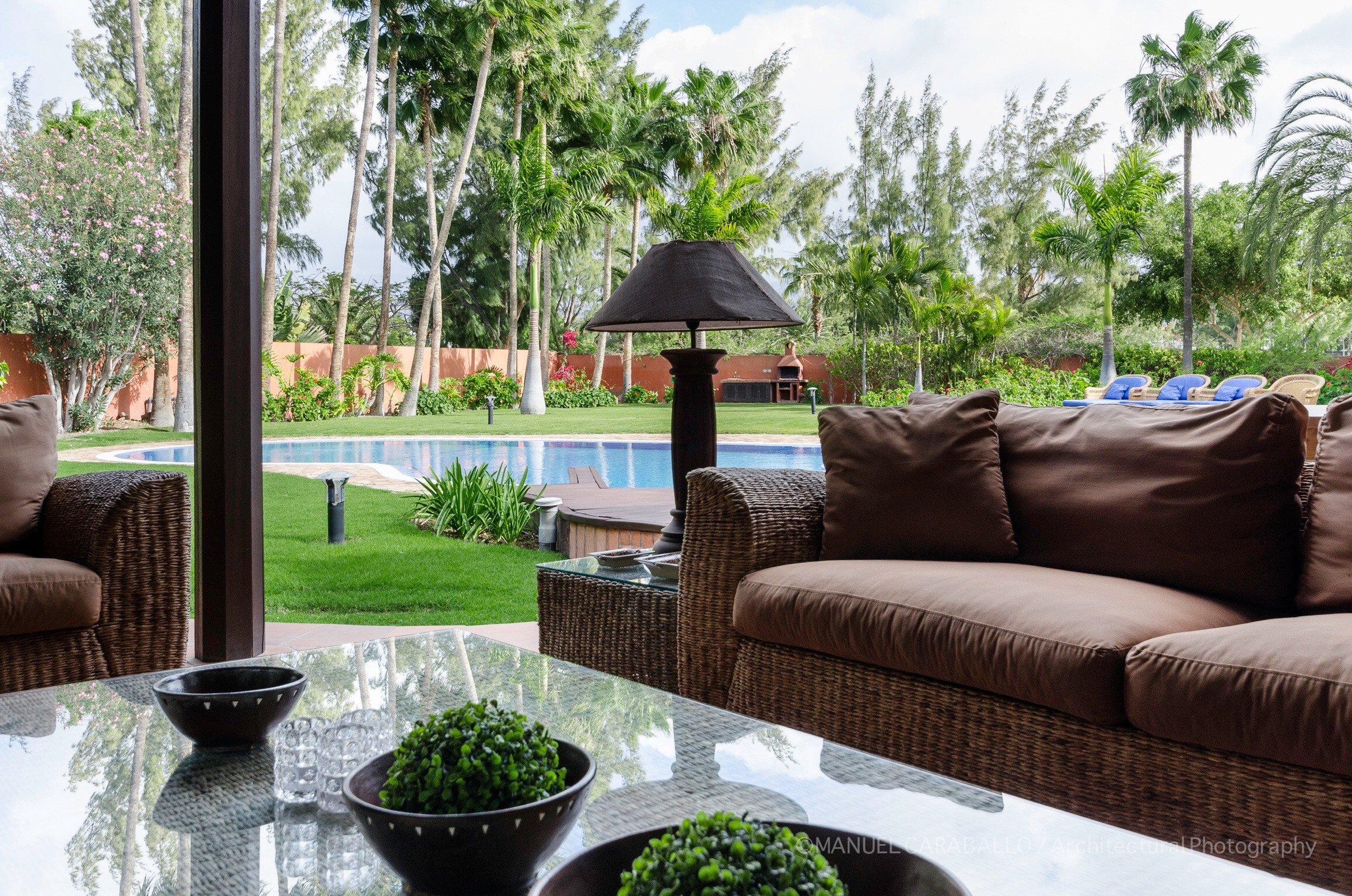 Spacious teak wood terrace, with outdoor dining area for 10 people and chill-out area with views of the golf course.