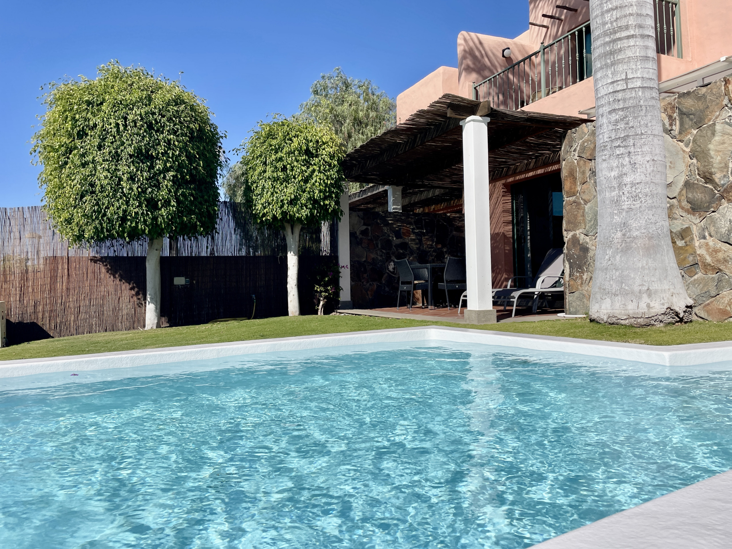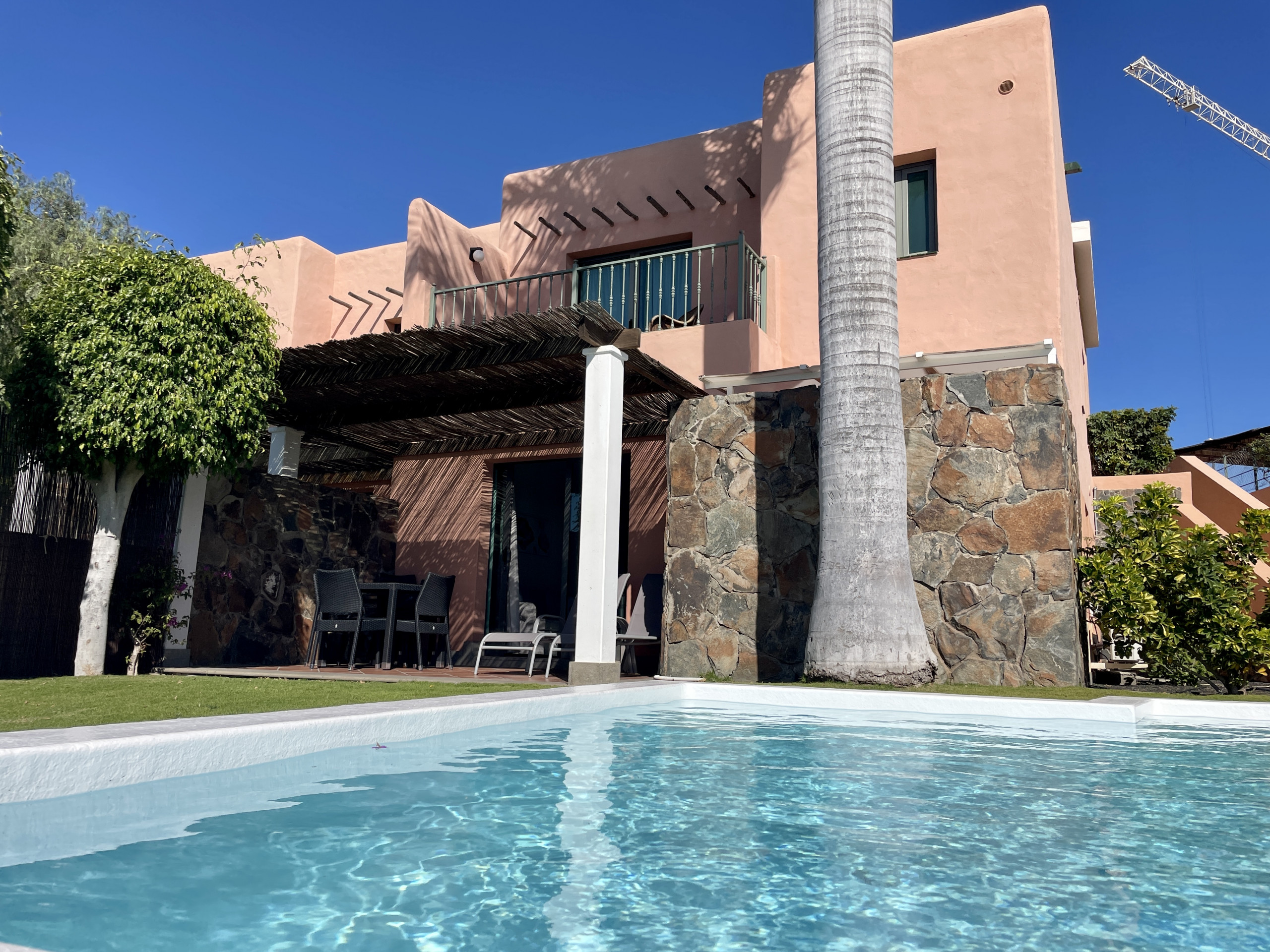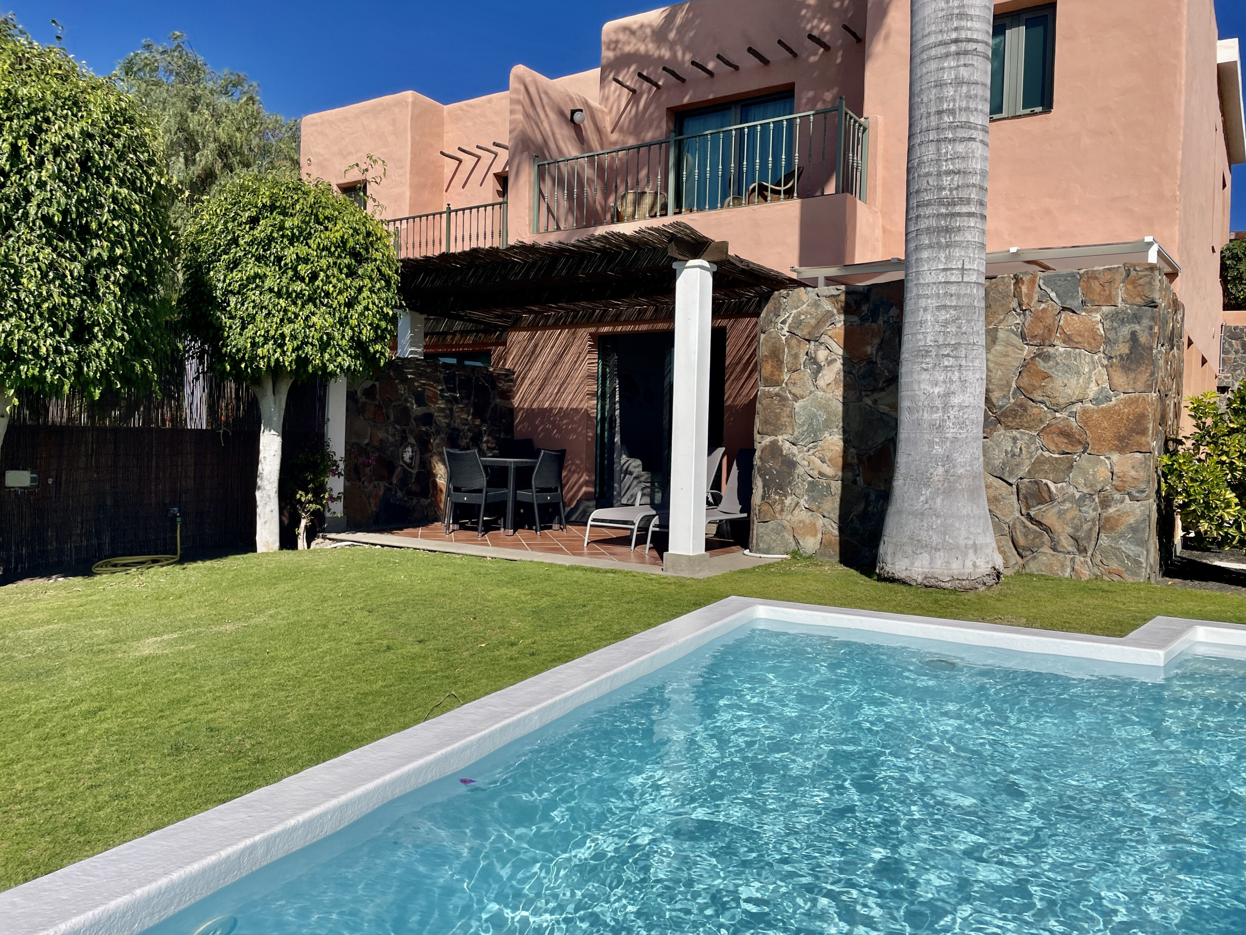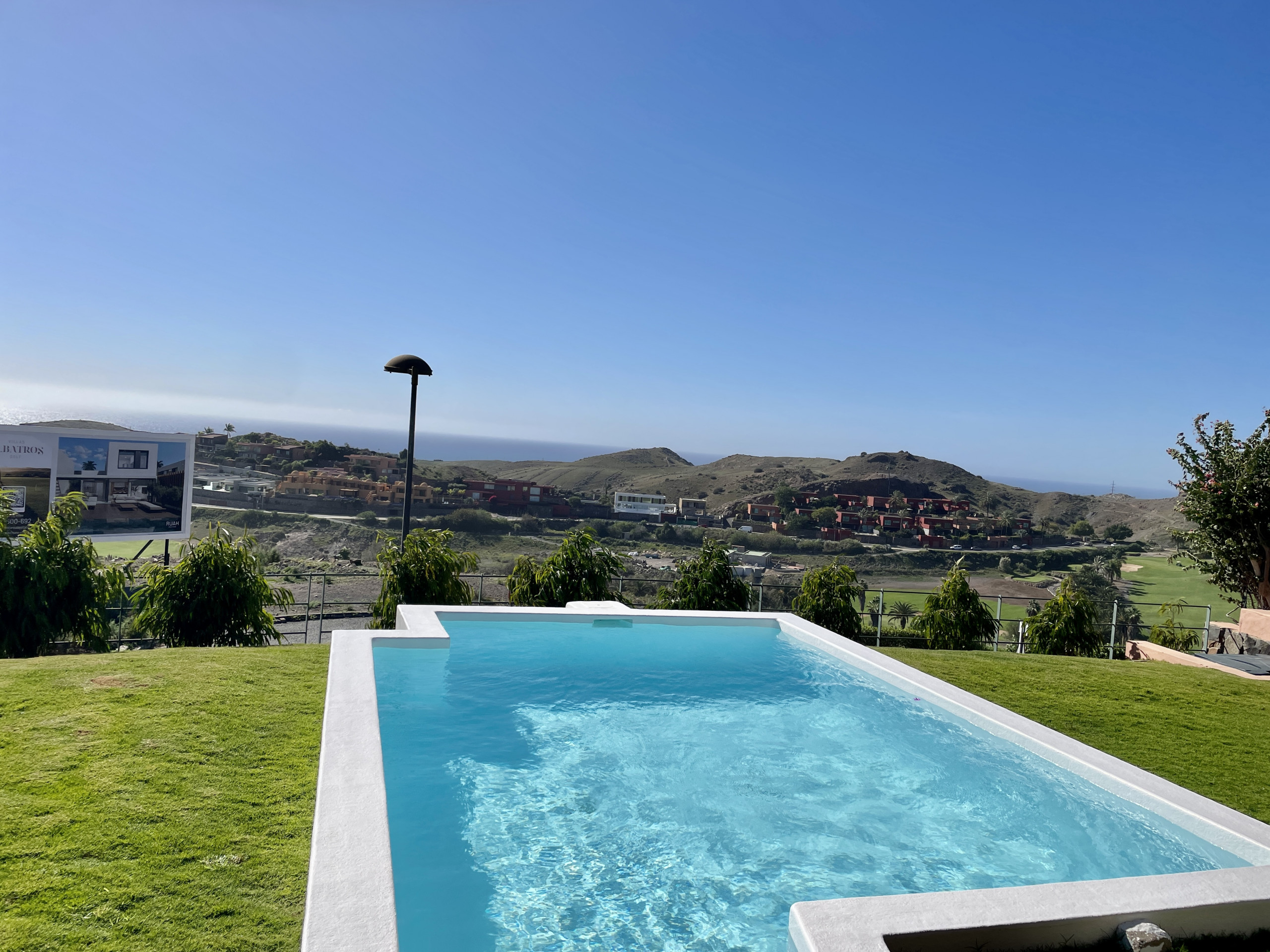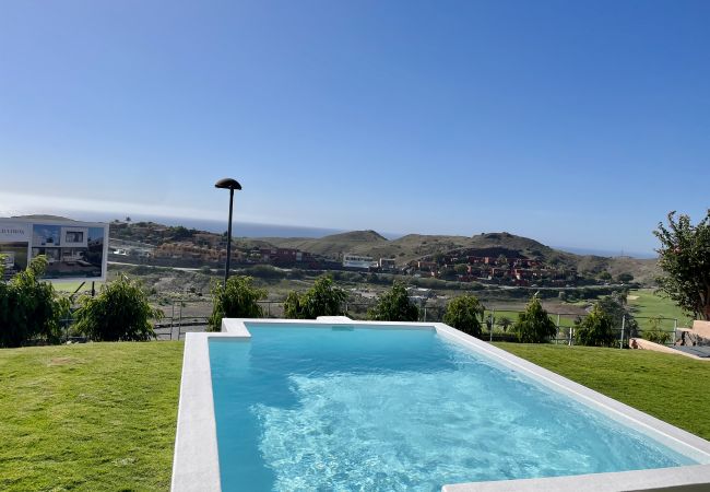 Our villa of 240 m² is located in Salobre Golf in a private urbanisation. It has 3 bedrooms and can accommodate up to 6 people. It has a private swimming pool with the possibility of air conditioning and beautiful views of the golf course, the mountains and the sea. On the other hand, the complex also has a large communal swimming pool.
